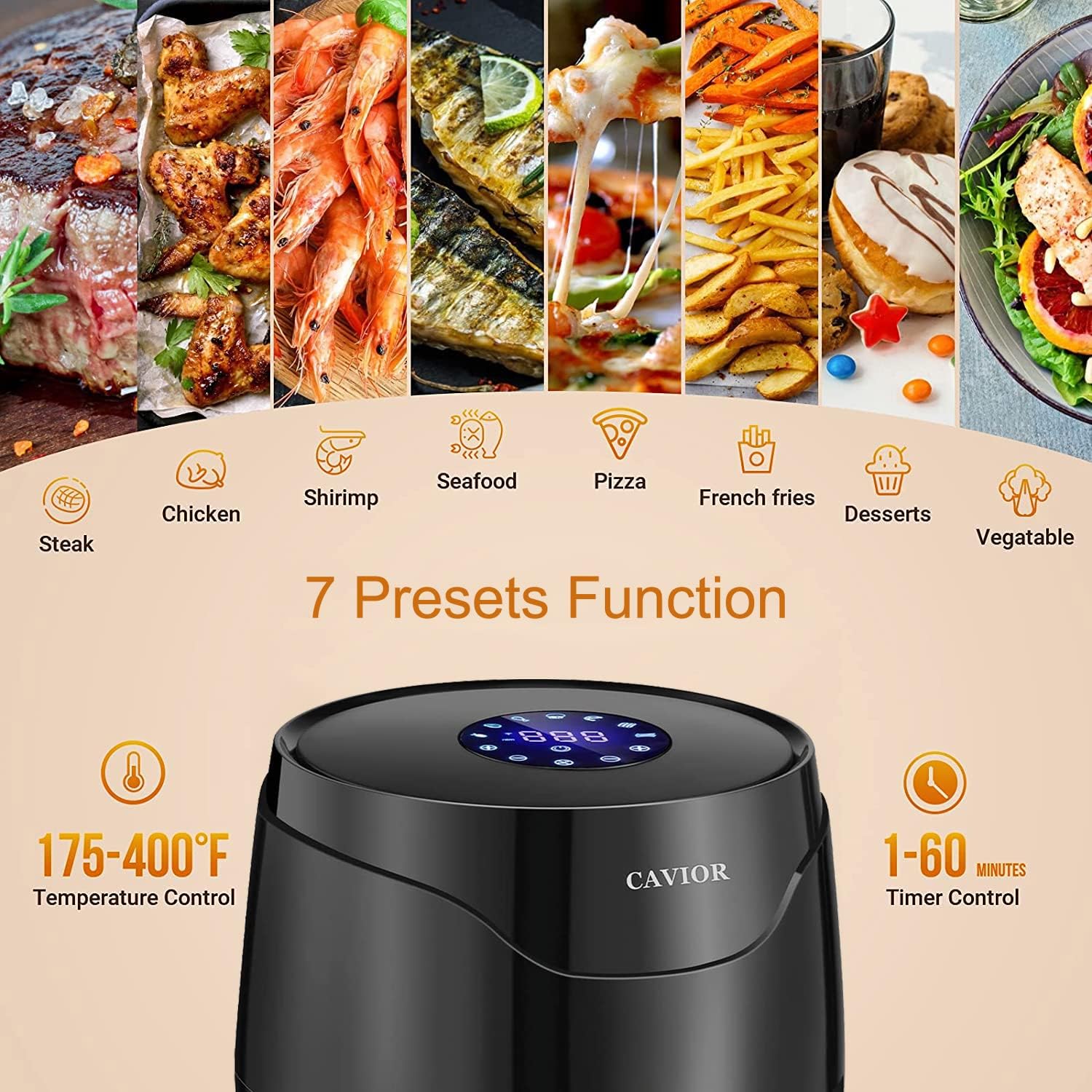 - CAVIOR air fryer adopts a rapid 360°air circulation to cook food with less or no oil. It’s still far healthier and 95% less oil than deep frying or even baking on a sheet in the oven. The hot air fryer can provide a variety of tasty dishes in a healthy, quick and easy way! When holding a party, such as French fries, chicken wings, meat, shrimp, fish and cake. Your family and friends will love it!.