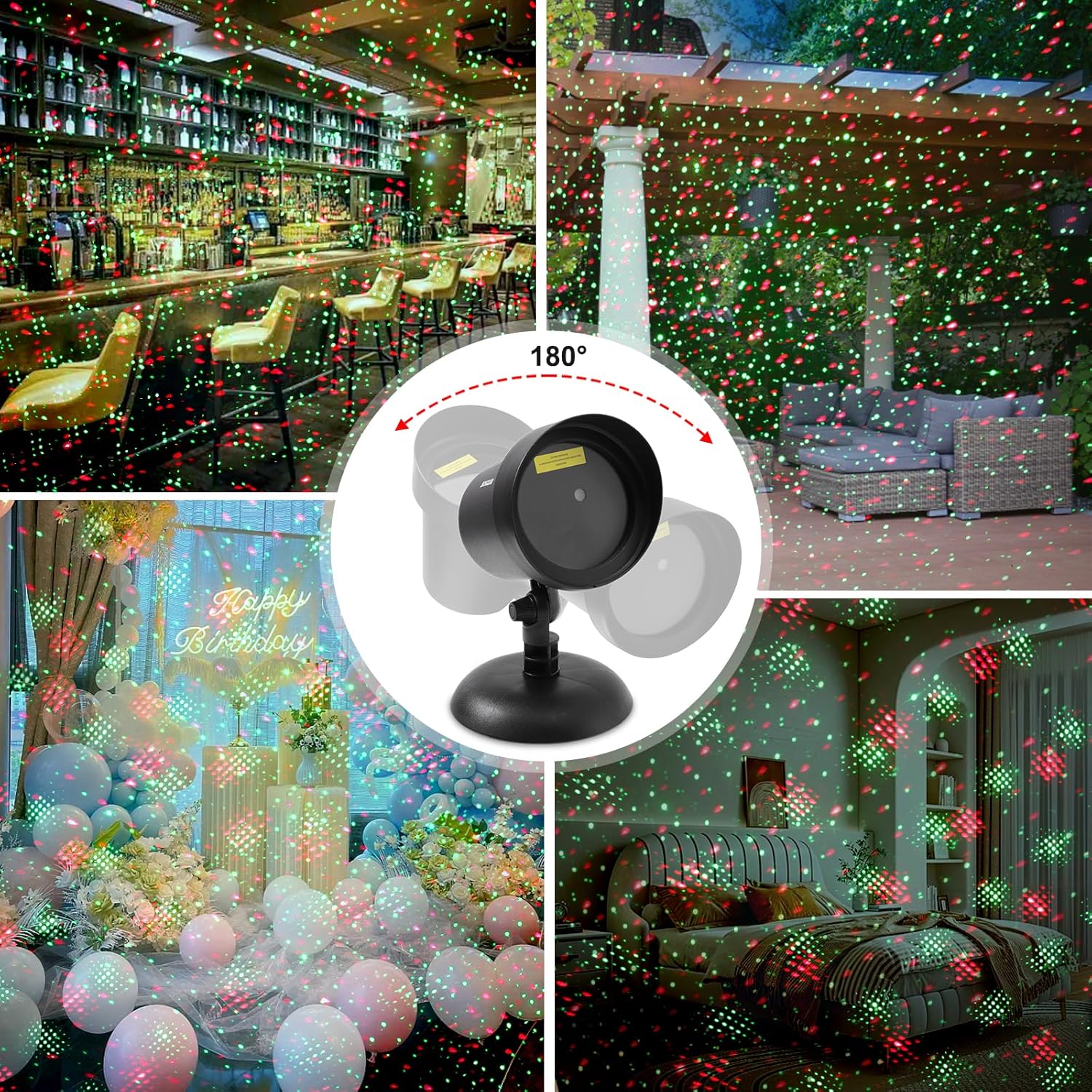 - [Multipurpose Light Projector] - The waterproof Holiday laser light projector outdoor is designed for Xmas and different festival, it can be used for family party, wedding, performing show, birthday, celebration, so it can be used in various places , such as villa house wall, home room, shopping mall, night club, bar, garden, plaza, restaurant, Karaoke, laser light show, its steady red and green light stars create fantastic effect easily