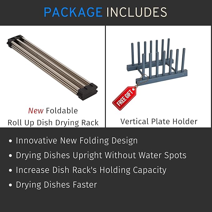 - Weights up to 50% heavier than other stainless steel roll-up dish drying racks of similar size; no toxic VOC smell often comes with the silicone-coated dish racks; new effortless foldable design for easy storage; more hygienic than a dish drying mat, this is the latest must-have kitchen accessory for a clean and tidy kitchen. Check out our product listing videos to see the differences!